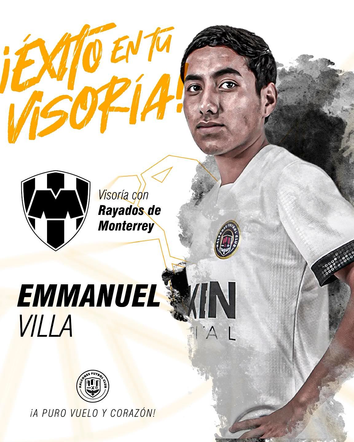 Halcones Fútbol Club informó con emoción la salida de su jugador Emmanuel Villa, quien fue llamado para realizar visorías en las filas de los Rayados de Monterrey.